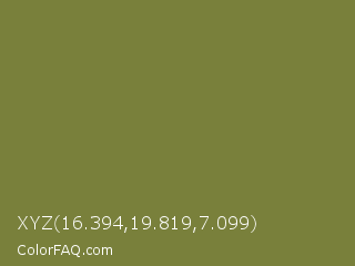 XYZ 16.394,19.819,7.099 Color is a normal yellow color and the nearest color is Old Moss Green #867e36. Hex code #79803b and RGB value is rgb(121,128,59). In RGB color space, this color is composed of 47% red, 50% green, 23% blue, In CMYK color space, this color is composed of 5% cyan, 0% magenta, 54% yellow , 50% black , In HSL color space, this color has a hue angle of 66° , 37% saturation and 37% lightness.