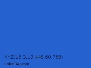 XYZ 16.3,13.448,60.768 Color is a normal blue color and the nearest color is Mariner #286acd. Hex code #2561cf and RGB value is rgb(37,97,207). In RGB color space, this color is composed of 15% red, 38% green, 81% blue, In CMYK color space, this color is composed of 82% cyan, 53% magenta, 0% yellow , 19% black , In HSL color space, this color has a hue angle of 219° , 70% saturation and 48% lightness.