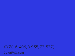 XYZ 16.406,8.955,73.537 Color is a normal blue color and the nearest color is Palatinate Blue #273be2. Hex code #2e38e3 and RGB value is rgb(46,56,227). In RGB color space, this color is composed of 18% red, 22% green, 89% blue, In CMYK color space, this color is composed of 80% cyan, 75% magenta, 0% yellow , 11% black , In HSL color space, this color has a hue angle of 237° , 76% saturation and 54% lightness.