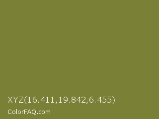 XYZ 16.411,19.842,6.455 Color is a normal yellow color and the nearest color is Pesto #7c7631. Hex code #7a8036 and RGB value is rgb(122,128,54). In RGB color space, this color is composed of 48% red, 50% green, 21% blue, In CMYK color space, this color is composed of 5% cyan, 0% magenta, 58% yellow , 50% black , In HSL color space, this color has a hue angle of 65° , 41% saturation and 36% lightness.
