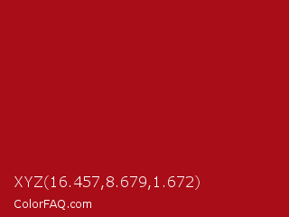 XYZ 16.457,8.679,1.672 Color is a normal red color and the nearest color is Spartan Crimson #9e1316. Hex code #a80d18 and RGB value is rgb(168,13,24). In RGB color space, this color is composed of 66% red, 5% green, 9% blue, In CMYK color space, this color is composed of 0% cyan, 92% magenta, 86% yellow , 34% black , In HSL color space, this color has a hue angle of 356° , 86% saturation and 35% lightness.