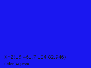 XYZ 16.461,7.124,82.946 Color is a normal indigo color and the nearest color is Bluebonnet #1c1cf0. Hex code #1a17f0 and RGB value is rgb(26,23,240). In RGB color space, this color is composed of 10% red, 9% green, 94% blue, In CMYK color space, this color is composed of 89% cyan, 90% magenta, 0% yellow , 6% black , In HSL color space, this color has a hue angle of 241° , 88% saturation and 52% lightness.
