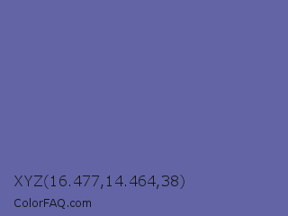 XYZ 16.477,14.464,38 Color is a normal blue color and the nearest color is Scampi #675fa6. Hex code #6264a6 and RGB value is rgb(98,100,166). In RGB color space, this color is composed of 38% red, 39% green, 65% blue, In CMYK color space, this color is composed of 41% cyan, 40% magenta, 0% yellow , 35% black , In HSL color space, this color has a hue angle of 238° , 28% saturation and 52% lightness.