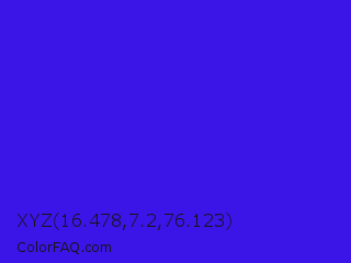XYZ 16.478,7.2,76.123 Color is a normal indigo color and the nearest color is Interdimensional Blue #360ccc. Hex code #3b14e7 and RGB value is rgb(59,20,231). In RGB color space, this color is composed of 23% red, 8% green, 91% blue, In CMYK color space, this color is composed of 74% cyan, 91% magenta, 0% yellow , 9% black , In HSL color space, this color has a hue angle of 251° , 84% saturation and 49% lightness.