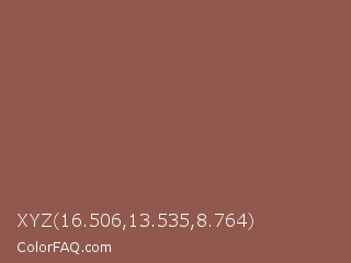 XYZ 16.506,13.535,8.764 Color is a normal red color and the nearest color is Spicy Mix #8b5f4d. Hex code #91584d and RGB value is rgb(145,88,77). In RGB color space, this color is composed of 57% red, 35% green, 30% blue, In CMYK color space, this color is composed of 0% cyan, 39% magenta, 47% yellow , 43% black , In HSL color space, this color has a hue angle of 10° , 31% saturation and 44% lightness.