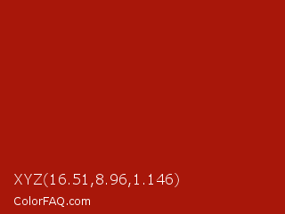 XYZ 16.51,8.96,1.146 Color is a normal red color and the nearest color is Rufous #a81c07. Hex code #a8170a and RGB value is rgb(168,23,10). In RGB color space, this color is composed of 66% red, 9% green, 4% blue, In CMYK color space, this color is composed of 0% cyan, 86% magenta, 94% yellow , 34% black , In HSL color space, this color has a hue angle of 5° , 89% saturation and 35% lightness.