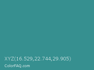 XYZ 16.529,22.744,29.905 Color is a normal cyan color and the nearest color is Lochinvar #2c8c84. Hex code #369090 and RGB value is rgb(54,144,144). In RGB color space, this color is composed of 21% red, 56% green, 56% blue, In CMYK color space, this color is composed of 63% cyan, 0% magenta, 0% yellow , 44% black , In HSL color space, this color has a hue angle of 180° , 45% saturation and 39% lightness.