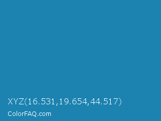 XYZ 16.531,19.654,44.517 Color is a normal blue color and the nearest color is Cyan Cornflower Blue #188bc2. Hex code #1c83b1 and RGB value is rgb(28,131,177). In RGB color space, this color is composed of 11% red, 51% green, 69% blue, In CMYK color space, this color is composed of 84% cyan, 26% magenta, 0% yellow , 31% black , In HSL color space, this color has a hue angle of 199° , 73% saturation and 40% lightness.