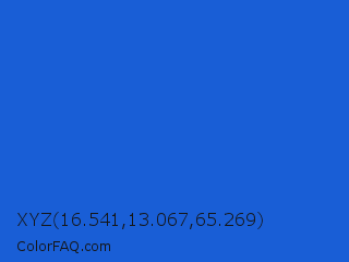 XYZ 16.541,13.067,65.269 Color is a normal blue color and the nearest color is Mariner #286acd. Hex code #195ed6 and RGB value is rgb(25,94,214). In RGB color space, this color is composed of 10% red, 37% green, 84% blue, In CMYK color space, this color is composed of 88% cyan, 56% magenta, 0% yellow , 16% black , In HSL color space, this color has a hue angle of 218° , 79% saturation and 47% lightness.