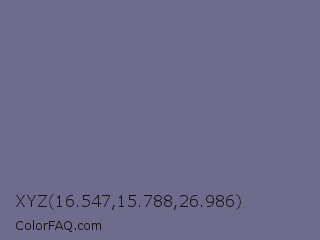 XYZ 16.547,15.788,26.986 Color is a normal indigo color and the nearest color is Rum #796989. Hex code #6f6b8c and RGB value is rgb(111,107,140). In RGB color space, this color is composed of 44% red, 42% green, 55% blue, In CMYK color space, this color is composed of 21% cyan, 24% magenta, 0% yellow , 45% black , In HSL color space, this color has a hue angle of 247° , 13% saturation and 48% lightness.