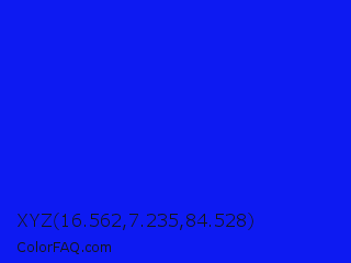 XYZ 16.562,7.235,84.528 Color is a normal blue color and the nearest color is Bluebonnet #1c1cf0. Hex code #0d1af2 and RGB value is rgb(13,26,242). In RGB color space, this color is composed of 5% red, 10% green, 95% blue, In CMYK color space, this color is composed of 95% cyan, 89% magenta, 0% yellow , 5% black , In HSL color space, this color has a hue angle of 237° , 90% saturation and 50% lightness.