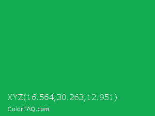 XYZ 16.564,30.263,12.951 Color is a normal green color and the nearest color is Green Pigment #00a550. Hex code #14ac52 and RGB value is rgb(20,172,82). In RGB color space, this color is composed of 8% red, 67% green, 32% blue, In CMYK color space, this color is composed of 88% cyan, 0% magenta, 52% yellow , 33% black , In HSL color space, this color has a hue angle of 144° , 79% saturation and 38% lightness.