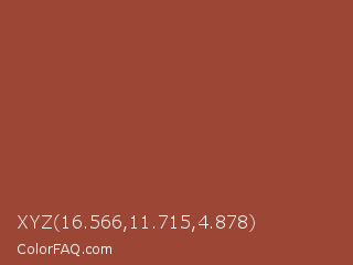 XYZ 16.566,11.715,4.878 Color is a normal red color and the nearest color is Chestnut #954535. Hex code #9c4636 and RGB value is rgb(156,70,54). In RGB color space, this color is composed of 61% red, 27% green, 21% blue, In CMYK color space, this color is composed of 0% cyan, 55% magenta, 65% yellow , 39% black , In HSL color space, this color has a hue angle of 9° , 49% saturation and 41% lightness.