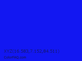 XYZ 16.583,7.152,84.511 Color is a normal blue color and the nearest color is Bluebonnet #1c1cf0. Hex code #1217f2 and RGB value is rgb(18,23,242). In RGB color space, this color is composed of 7% red, 9% green, 95% blue, In CMYK color space, this color is composed of 93% cyan, 90% magenta, 0% yellow , 5% black , In HSL color space, this color has a hue angle of 239° , 90% saturation and 51% lightness.