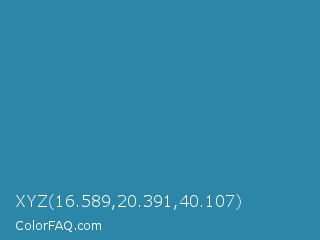 XYZ 16.589,20.391,40.107 Color is a normal blue color and the nearest color is Astral #327da0. Hex code #2b86a8 and RGB value is rgb(43,134,168). In RGB color space, this color is composed of 17% red, 53% green, 66% blue, In CMYK color space, this color is composed of 74% cyan, 20% magenta, 0% yellow , 34% black , In HSL color space, this color has a hue angle of 196° , 59% saturation and 41% lightness.