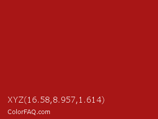 XYZ 16.58,8.957,1.614 Color is a normal red color and the nearest color is Spartan Crimson #9e1316. Hex code #a81616 and RGB value is rgb(168,22,22). In RGB color space, this color is composed of 66% red, 9% green, 9% blue, In CMYK color space, this color is composed of 0% cyan, 87% magenta, 87% yellow , 34% black , In HSL color space, this color has a hue angle of 0° , 77% saturation and 37% lightness.