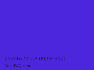 XYZ 16.592,8.09,68.397 Color is a normal indigo color and the nearest color is Han Purple #5218fa. Hex code #4c26dc and RGB value is rgb(76,38,220). In RGB color space, this color is composed of 30% red, 15% green, 86% blue, In CMYK color space, this color is composed of 65% cyan, 83% magenta, 0% yellow , 14% black , In HSL color space, this color has a hue angle of 253° , 72% saturation and 51% lightness.
