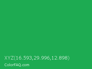 XYZ 16.593,29.996,12.898 Color is a normal green color and the nearest color is Green Pigment #00a550. Hex code #1dab52 and RGB value is rgb(29,171,82). In RGB color space, this color is composed of 11% red, 67% green, 32% blue, In CMYK color space, this color is composed of 83% cyan, 0% magenta, 52% yellow , 33% black , In HSL color space, this color has a hue angle of 142° , 71% saturation and 39% lightness.