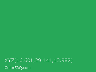 XYZ 16.601,29.141,13.982 Color is a normal green color and the nearest color is Chateau Green #40a860. Hex code #27a858 and RGB value is rgb(39,168,88). In RGB color space, this color is composed of 15% red, 66% green, 35% blue, In CMYK color space, this color is composed of 77% cyan, 0% magenta, 48% yellow , 34% black , In HSL color space, this color has a hue angle of 143° , 62% saturation and 41% lightness.