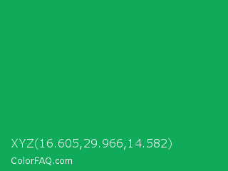 XYZ 16.605,29.966,14.582 Color is a normal green color and the nearest color is Green Pigment #00a550. Hex code #0fab5a and RGB value is rgb(15,171,90). In RGB color space, this color is composed of 6% red, 67% green, 35% blue, In CMYK color space, this color is composed of 91% cyan, 0% magenta, 47% yellow , 33% black , In HSL color space, this color has a hue angle of 149° , 84% saturation and 36% lightness.