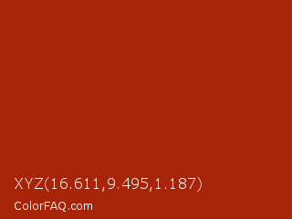 XYZ 16.611,9.495,1.187 Color is a normal red color and the nearest color is Rufous #a81c07. Hex code #a72408 and RGB value is rgb(167,36,8). In RGB color space, this color is composed of 65% red, 14% green, 3% blue, In CMYK color space, this color is composed of 0% cyan, 78% magenta, 95% yellow , 35% black , In HSL color space, this color has a hue angle of 11° , 91% saturation and 34% lightness.