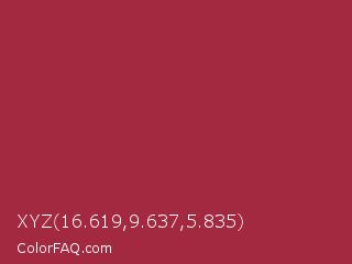 XYZ 16.619,9.637,5.835 Color is a normal red color and the nearest color is Big Dip O Ruby #9c2542. Hex code #a22940 and RGB value is rgb(162,41,64). In RGB color space, this color is composed of 64% red, 16% green, 25% blue, In CMYK color space, this color is composed of 0% cyan, 75% magenta, 60% yellow , 36% black , In HSL color space, this color has a hue angle of 349° , 60% saturation and 40% lightness.