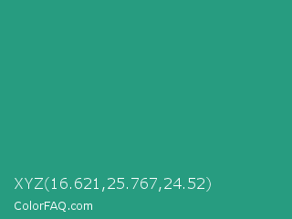 XYZ 16.621,25.767,24.52 Color is a normal cyan color and the nearest color is Jungle Green #29ab87. Hex code #279c80 and RGB value is rgb(39,156,128). In RGB color space, this color is composed of 15% red, 61% green, 50% blue, In CMYK color space, this color is composed of 75% cyan, 0% magenta, 18% yellow , 39% black , In HSL color space, this color has a hue angle of 166° , 60% saturation and 38% lightness.