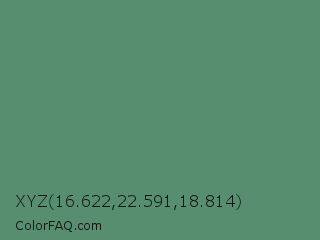 XYZ 16.622,22.591,18.814 Color is a normal green color and the nearest color is Wintergreen Dream #56887d. Hex code #588e70 and RGB value is rgb(88,142,112). In RGB color space, this color is composed of 35% red, 56% green, 44% blue, In CMYK color space, this color is composed of 38% cyan, 0% magenta, 21% yellow , 44% black , In HSL color space, this color has a hue angle of 147° , 23% saturation and 45% lightness.