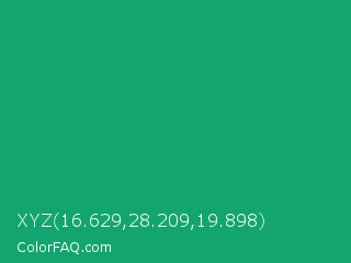 XYZ 16.629,28.209,19.898 Color is a normal green color and the nearest color is Green Crayola #1cac78. Hex code #12a570 and RGB value is rgb(18,165,112). In RGB color space, this color is composed of 7% red, 65% green, 44% blue, In CMYK color space, this color is composed of 89% cyan, 0% magenta, 32% yellow , 35% black , In HSL color space, this color has a hue angle of 158° , 80% saturation and 36% lightness.