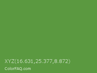 XYZ 16.631,25.377,8.872 Color is a normal green color and the nearest color is May Green #4c9141. Hex code #5b9940 and RGB value is rgb(91,153,64). In RGB color space, this color is composed of 36% red, 60% green, 25% blue, In CMYK color space, this color is composed of 41% cyan, 0% magenta, 58% yellow , 40% black , In HSL color space, this color has a hue angle of 102° , 41% saturation and 43% lightness.