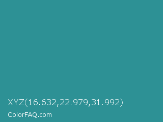 XYZ 16.632,22.979,31.992 Color is a normal cyan color and the nearest color is Lochinvar #2c8c84. Hex code #2d9195 and RGB value is rgb(45,145,149). In RGB color space, this color is composed of 18% red, 57% green, 58% blue, In CMYK color space, this color is composed of 70% cyan, 3% magenta, 0% yellow , 42% black , In HSL color space, this color has a hue angle of 182° , 54% saturation and 38% lightness.