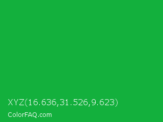 XYZ 16.636,31.526,9.623 Color is a normal green color and the nearest color is Green Pantone #00ad43. Hex code #13b03d and RGB value is rgb(19,176,61). In RGB color space, this color is composed of 7% red, 69% green, 24% blue, In CMYK color space, this color is composed of 89% cyan, 0% magenta, 65% yellow , 31% black , In HSL color space, this color has a hue angle of 136° , 81% saturation and 38% lightness.