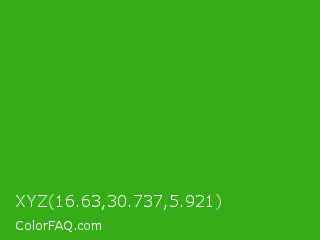 XYZ 16.63,30.737,5.921 Color is a normal green color and the nearest color is Kelly Green #4cbb17. Hex code #36ad18 and RGB value is rgb(54,173,24). In RGB color space, this color is composed of 21% red, 68% green, 9% blue, In CMYK color space, this color is composed of 69% cyan, 0% magenta, 86% yellow , 32% black , In HSL color space, this color has a hue angle of 108° , 76% saturation and 39% lightness.