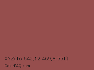 XYZ 16.642,12.469,8.551 Color is a normal red color and the nearest color is Copper Rust #944747. Hex code #964e4d and RGB value is rgb(150,78,77). In RGB color space, this color is composed of 59% red, 31% green, 30% blue, In CMYK color space, this color is composed of 0% cyan, 48% magenta, 49% yellow , 41% black , In HSL color space, this color has a hue angle of 1° , 32% saturation and 45% lightness.