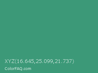 XYZ 16.645,25.099,21.737 Color is a normal green color and the nearest color is Illuminating Emerald #319177. Hex code #3c9978 and RGB value is rgb(60,153,120). In RGB color space, this color is composed of 24% red, 60% green, 47% blue, In CMYK color space, this color is composed of 61% cyan, 0% magenta, 22% yellow , 40% black , In HSL color space, this color has a hue angle of 159° , 44% saturation and 42% lightness.