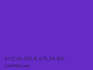 XYZ 16.652,8.676,54.83 Color is a normal violet color and the nearest color is Purple Heart Crayola #652dc1. Hex code #662bc7 and RGB value is rgb(102,43,199). In RGB color space, this color is composed of 40% red, 17% green, 78% blue, In CMYK color space, this color is composed of 49% cyan, 78% magenta, 0% yellow , 22% black , In HSL color space, this color has a hue angle of 263° , 64% saturation and 47% lightness.