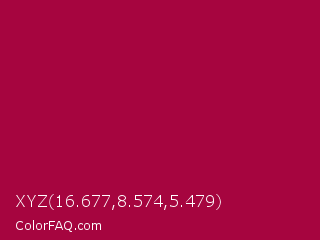 XYZ 16.677,8.574,5.479 Color is a normal rose color and the nearest color is Pink Raspberry #980036. Hex code #a6053f and RGB value is rgb(166,5,63). In RGB color space, this color is composed of 65% red, 2% green, 25% blue, In CMYK color space, this color is composed of 0% cyan, 97% magenta, 62% yellow , 35% black , In HSL color space, this color has a hue angle of 338° , 94% saturation and 34% lightness.