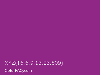 XYZ 16.6,9.13,23.809 Color is a normal magenta color and the nearest color is Razzmic Berry Crayola #843179. Hex code #902787 and RGB value is rgb(144,39,135). In RGB color space, this color is composed of 56% red, 15% green, 53% blue, In CMYK color space, this color is composed of 0% cyan, 73% magenta, 6% yellow , 44% black , In HSL color space, this color has a hue angle of 305° , 57% saturation and 36% lightness.
