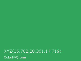 XYZ 16.702,28.361,14.719 Color is a normal green color and the nearest color is Chateau Green #40a860. Hex code #32a55c and RGB value is rgb(50,165,92). In RGB color space, this color is composed of 20% red, 65% green, 36% blue, In CMYK color space, this color is composed of 70% cyan, 0% magenta, 44% yellow , 35% black , In HSL color space, this color has a hue angle of 142° , 53% saturation and 42% lightness.