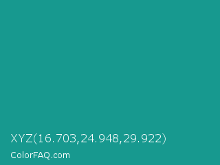 XYZ 16.703,24.948,29.922 Color is a normal cyan color and the nearest color is Blue Chill #0c8990. Hex code #17998f and RGB value is rgb(23,153,143). In RGB color space, this color is composed of 9% red, 60% green, 56% blue, In CMYK color space, this color is composed of 85% cyan, 0% magenta, 7% yellow , 40% black , In HSL color space, this color has a hue angle of 175° , 74% saturation and 35% lightness.