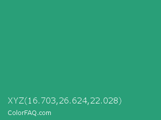 XYZ 16.703,26.624,22.028 Color is a normal green color and the nearest color is Illuminating Emerald #319177. Hex code #299f78 and RGB value is rgb(41,159,120). In RGB color space, this color is composed of 16% red, 62% green, 47% blue, In CMYK color space, this color is composed of 74% cyan, 0% magenta, 25% yellow , 38% black , In HSL color space, this color has a hue angle of 160° , 59% saturation and 39% lightness.