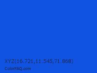 XYZ 16.721,11.545,71.868 Color is a normal blue color and the nearest color is New Car #214fc6. Hex code #1252e0 and RGB value is rgb(18,82,224). In RGB color space, this color is composed of 7% red, 32% green, 88% blue, In CMYK color space, this color is composed of 92% cyan, 63% magenta, 0% yellow , 12% black , In HSL color space, this color has a hue angle of 221° , 85% saturation and 47% lightness.