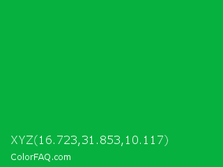 XYZ 16.723,31.853,10.117 Color is a normal green color and the nearest color is Green Pantone #00ad43. Hex code #06b140 and RGB value is rgb(6,177,64). In RGB color space, this color is composed of 2% red, 69% green, 25% blue, In CMYK color space, this color is composed of 97% cyan, 0% magenta, 64% yellow , 31% black , In HSL color space, this color has a hue angle of 140° , 93% saturation and 36% lightness.