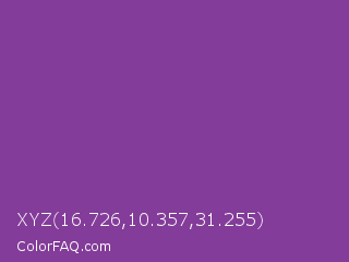 XYZ 16.726,10.357,31.255 Color is a normal purple color and the nearest color is Vivid Violet #803790. Hex code #833c99 and RGB value is rgb(131,60,153). In RGB color space, this color is composed of 51% red, 24% green, 60% blue, In CMYK color space, this color is composed of 14% cyan, 61% magenta, 0% yellow , 40% black , In HSL color space, this color has a hue angle of 286° , 44% saturation and 42% lightness.