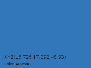 XYZ 16.726,17.392,48.93 Color is a normal blue color and the nearest color is Cyan Blue Azure #4682bf. Hex code #3177ba and RGB value is rgb(49,119,186). In RGB color space, this color is composed of 19% red, 47% green, 73% blue, In CMYK color space, this color is composed of 74% cyan, 36% magenta, 0% yellow , 27% black , In HSL color space, this color has a hue angle of 209° , 58% saturation and 46% lightness.