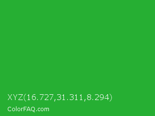 XYZ 16.727,31.311,8.294 Color is a normal green color and the nearest color is Wageningen Green #34b233. Hex code #26af33 and RGB value is rgb(38,175,51). In RGB color space, this color is composed of 15% red, 69% green, 20% blue, In CMYK color space, this color is composed of 78% cyan, 0% magenta, 71% yellow , 31% black , In HSL color space, this color has a hue angle of 126° , 64% saturation and 42% lightness.