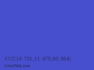 XYZ 16.731,11.475,60.364 Color is a normal blue color and the nearest color is Iris #5a4fcf. Hex code #484fcf and RGB value is rgb(72,79,207). In RGB color space, this color is composed of 28% red, 31% green, 81% blue, In CMYK color space, this color is composed of 65% cyan, 62% magenta, 0% yellow , 19% black , In HSL color space, this color has a hue angle of 237° , 58% saturation and 55% lightness.