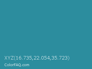 XYZ 16.735,22.054,35.723 Color is a normal cyan color and the nearest color is Astral #327da0. Hex code #2c8d9e and RGB value is rgb(44,141,158). In RGB color space, this color is composed of 17% red, 55% green, 62% blue, In CMYK color space, this color is composed of 72% cyan, 11% magenta, 0% yellow , 38% black , In HSL color space, this color has a hue angle of 189° , 56% saturation and 40% lightness.