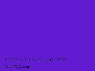 XYZ 16.73,7.926,60.323 Color is a normal violet color and the nearest color is Purple Heart Crayola #652dc1. Hex code #611cd0 and RGB value is rgb(97,28,208). In RGB color space, this color is composed of 38% red, 11% green, 82% blue, In CMYK color space, this color is composed of 53% cyan, 87% magenta, 0% yellow , 18% black , In HSL color space, this color has a hue angle of 263° , 76% saturation and 46% lightness.