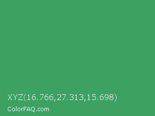 XYZ 16.766,27.313,15.698 Color is a normal green color and the nearest color is Chateau Green #40a860. Hex code #3ca161 and RGB value is rgb(60,161,97). In RGB color space, this color is composed of 24% red, 63% green, 38% blue, In CMYK color space, this color is composed of 63% cyan, 0% magenta, 40% yellow , 37% black , In HSL color space, this color has a hue angle of 142° , 46% saturation and 43% lightness.